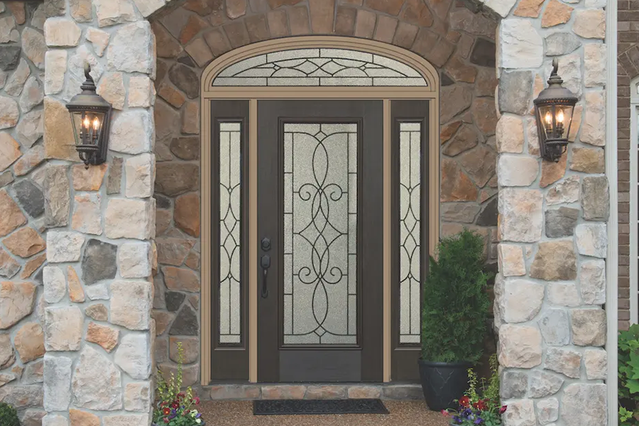 Ashbury door glass combines the distinctive wrought iron caming with our unique design on top of our textured granite glass, providing a one-of-a-kind look for your front door entryway and sidelights. The unique style offers an elegant, sturdy look with high-privacy for your door.