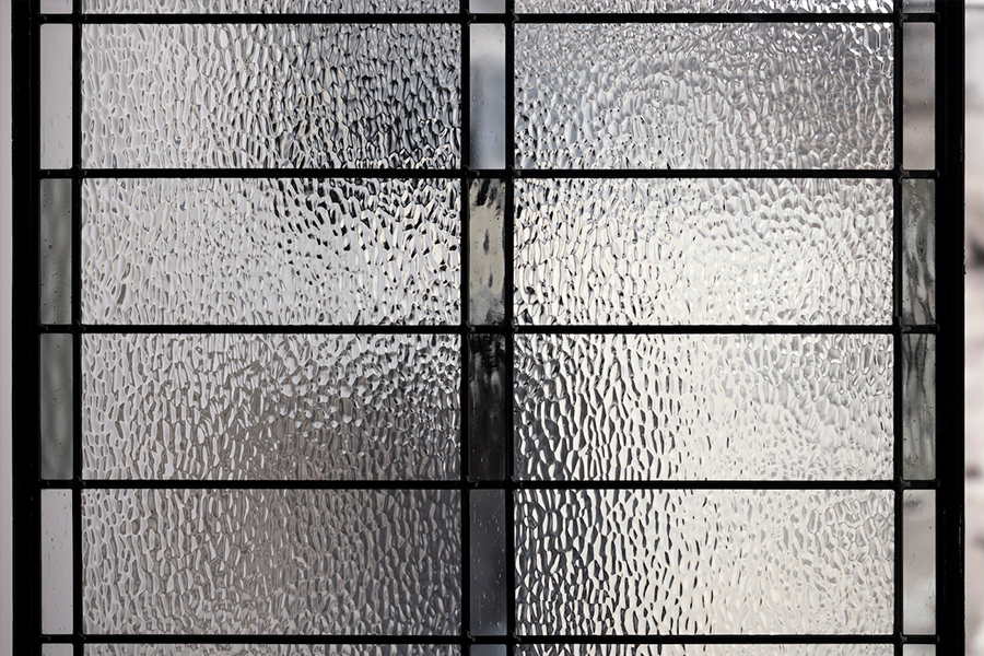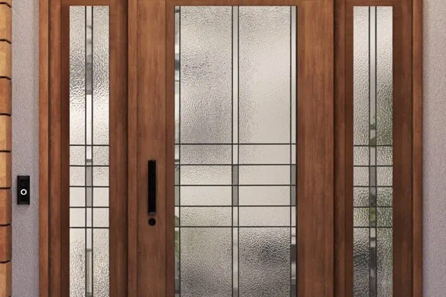 A contemporary nod to traditional door glass, Bay Point exudes lived-in luxury with its thoughtful minimalism. Panels of bold hammered texture create a medium level of privacy interspersed with eye-catching patina caming and accents of clear seedy and gray bubble glass to welcome visitors inside.