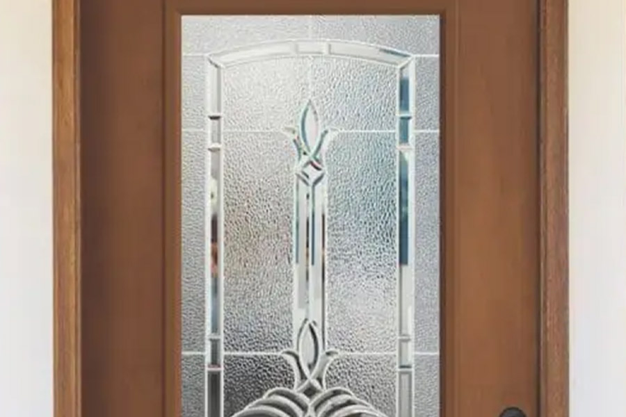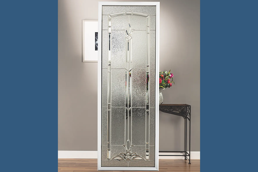 Bristol will add the finishing touch to your home’s Classic architecture. Your eye will be drawn to a clear bevel column extending the length of the doorglass. Satin nickel finishing softly defines Bristol’s lines. The hammered textured glass adds a high level of privacy.