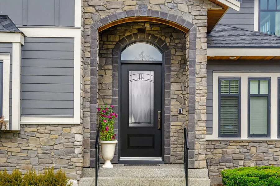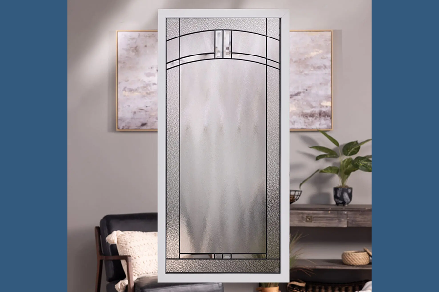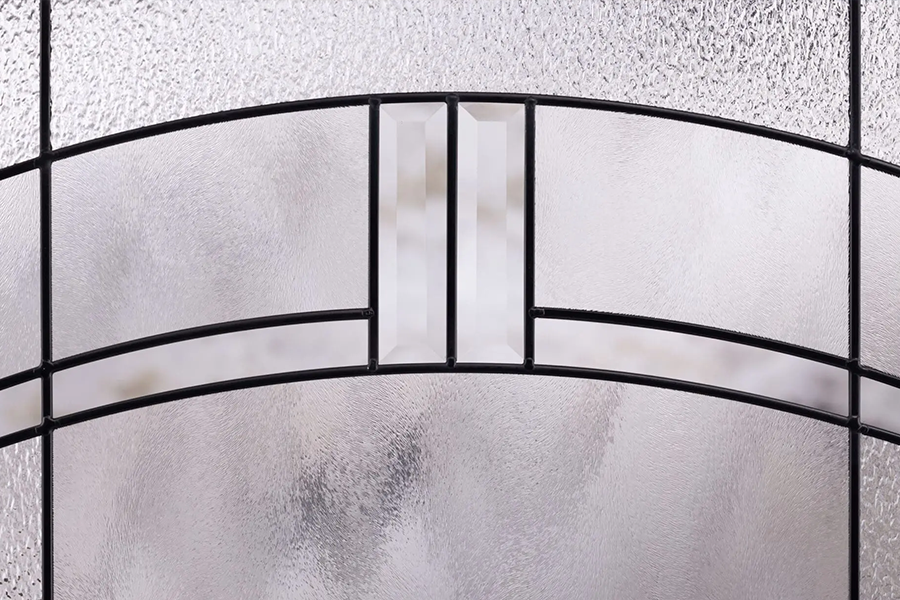 Taking inspiration from the arches and columns of majestic architecture, Empire creates a domain of its own. Details of feathered chinchilla glass intersect with granite textures and clear bevels for a high privacy finish.