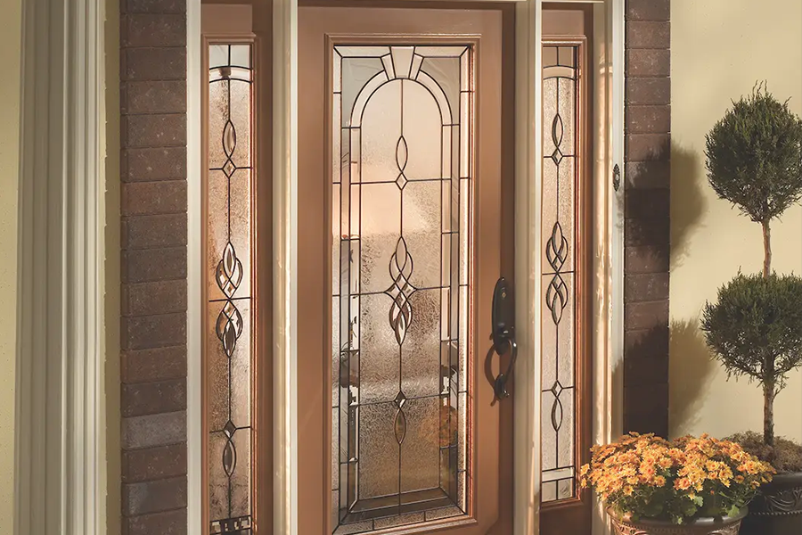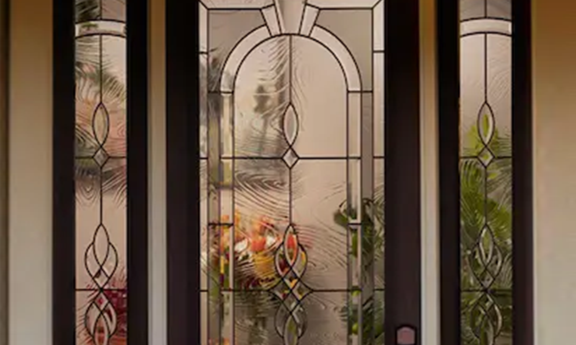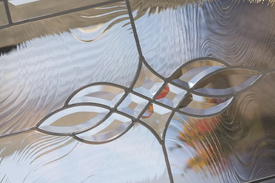 Glass-in-motion might be one way to describe Fontana. Dramatic swirls throughout the clear and translucent gray doorglass give your entrance door a dynamic and painterly touch. A formal arrangement of bevel clusters, patina or satin nickel finish, rounds out Fontana’s classic styling.