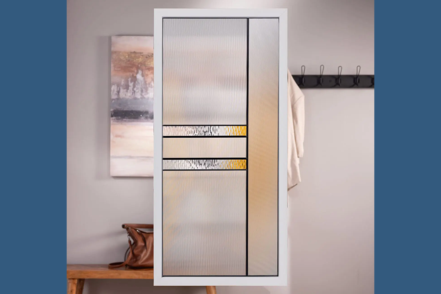 Neo creates modern sleek lines of its own. Details of clear soft wave glass intersect with thin reed glass and micro-cubed glass, with patina caming and a high privacy finish.