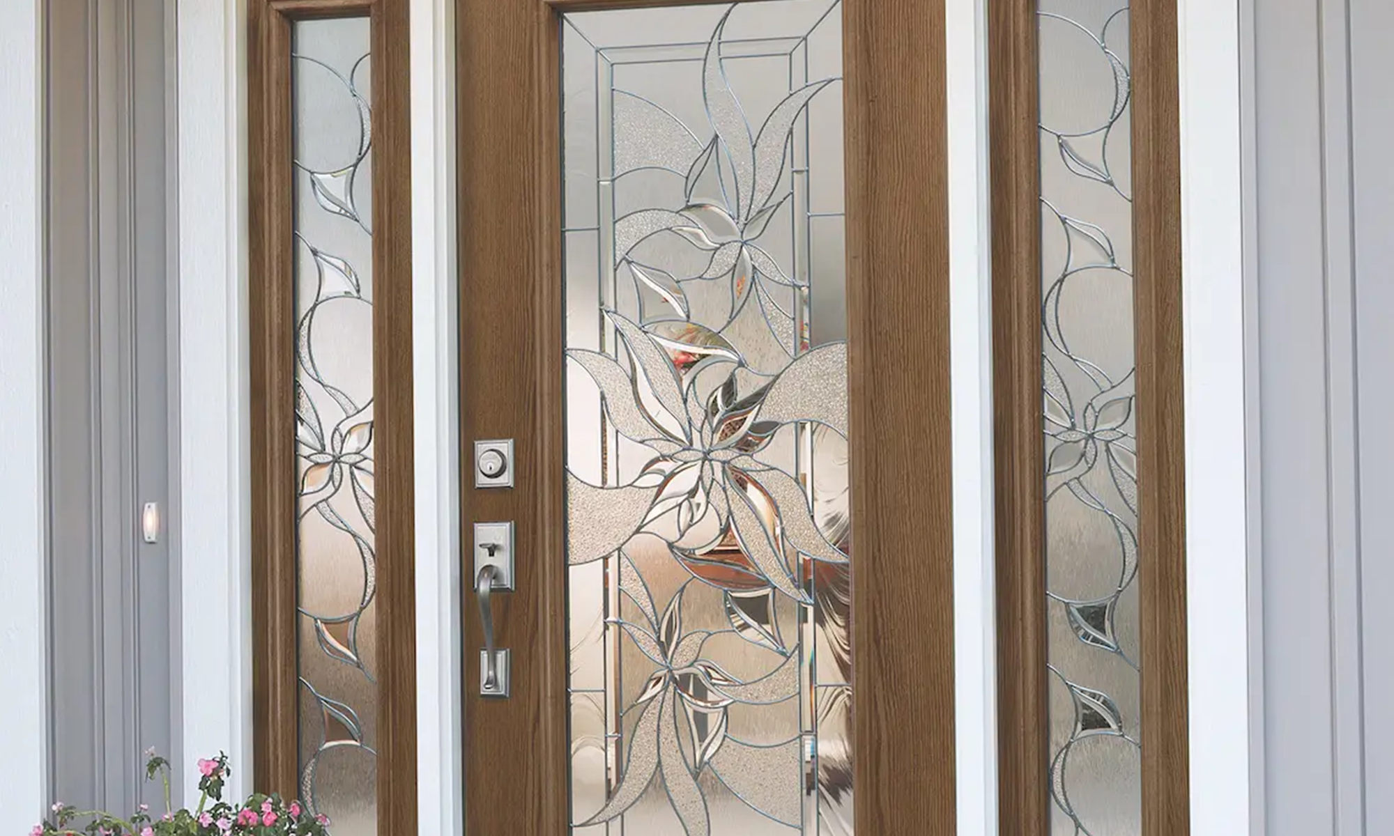 The sweeping floral patterns of our signature Impressions decorative glass are elegantly refreshed with nickel caming to create Renewed Impressions. The Contemporary design’s textured glass surface offers a high privacy level.