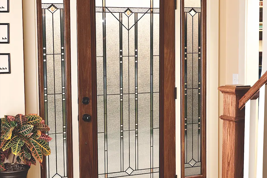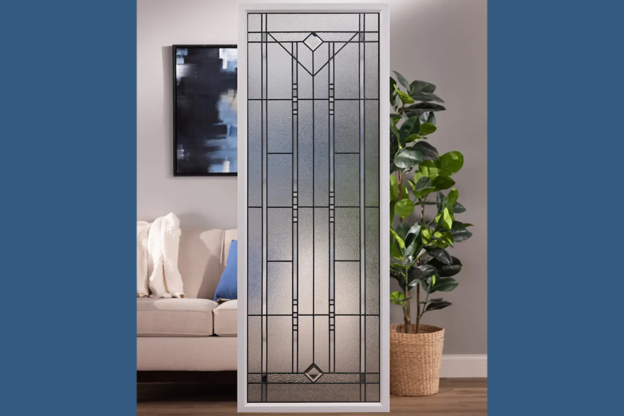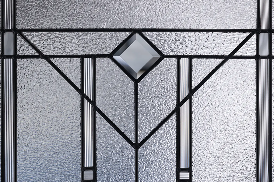 A formal landscape of glass is created with Riverwood’s exquisite arrangement of bevel clusters and scrolling. Old World styling includes a patina finish. Riverwood offers a medium-high level of privacy.